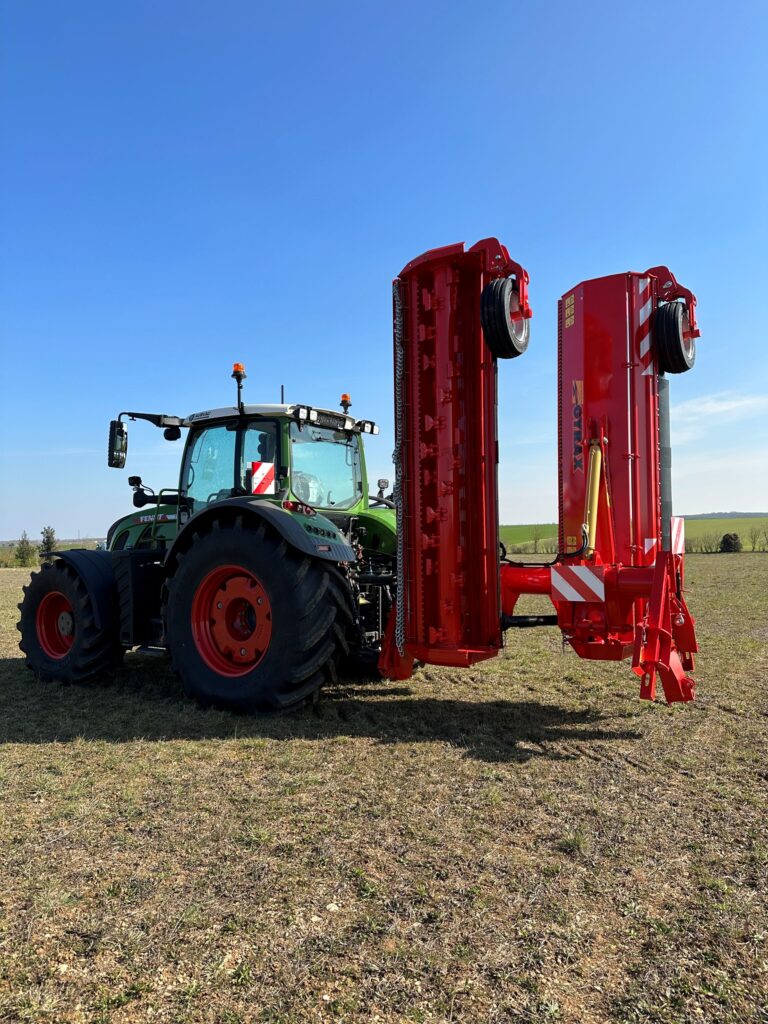 Au transport, la machine reste compacte grâce au repliage hydraulique des caissons, avec une largeur annoncée à 1,90 m, ce qui facilite les déplacements sur route et les accès étroits. Le repliage est assuré par deux vérins sécurisés avec clapets automatiques, afin de maintenir une configuration stable.